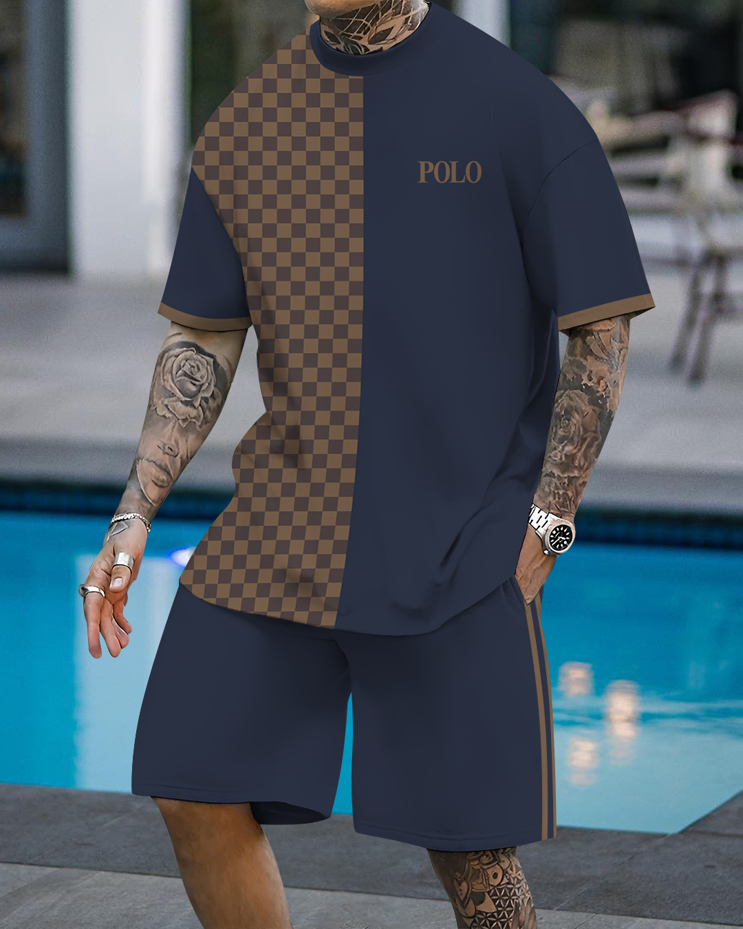 Men's fashion casual color matching printed short-sleeved two-piece set