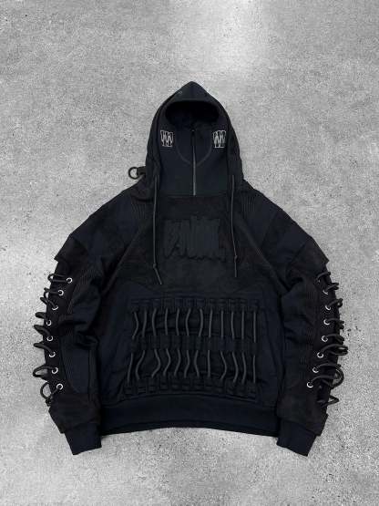 It features a built-in neoprene mask integrated into the hood, thick cords along the sleeves and back that add layered dimension, and a front kangaroo pocket with heavy cords. The design is finished with a chest “BANG” applique, and all the details of the hoodie are made to withstand long-term wear and maintain its structure over time.