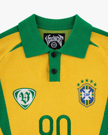 A tribute to the golden age of Brazilian football — this jersey is crafted in a deep yellow knit, contrasted with deep green panelling. Featuring the number 90 in delicate floral embroidery on the back and a reworked Brazil crest, beside the Vescartes “V” badge, on the front.