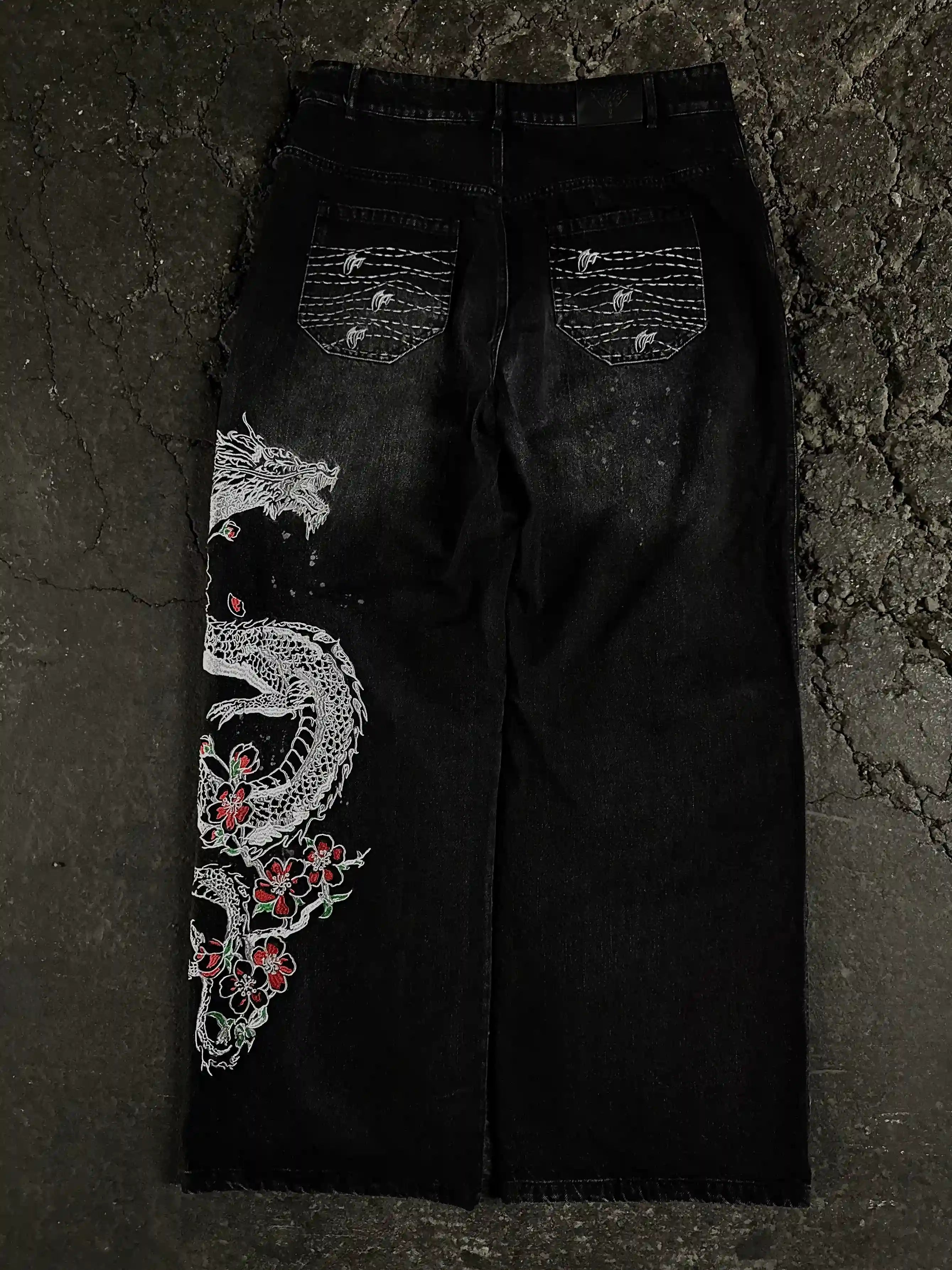 Left leg embroidered graphic: "Sakura Dragon"