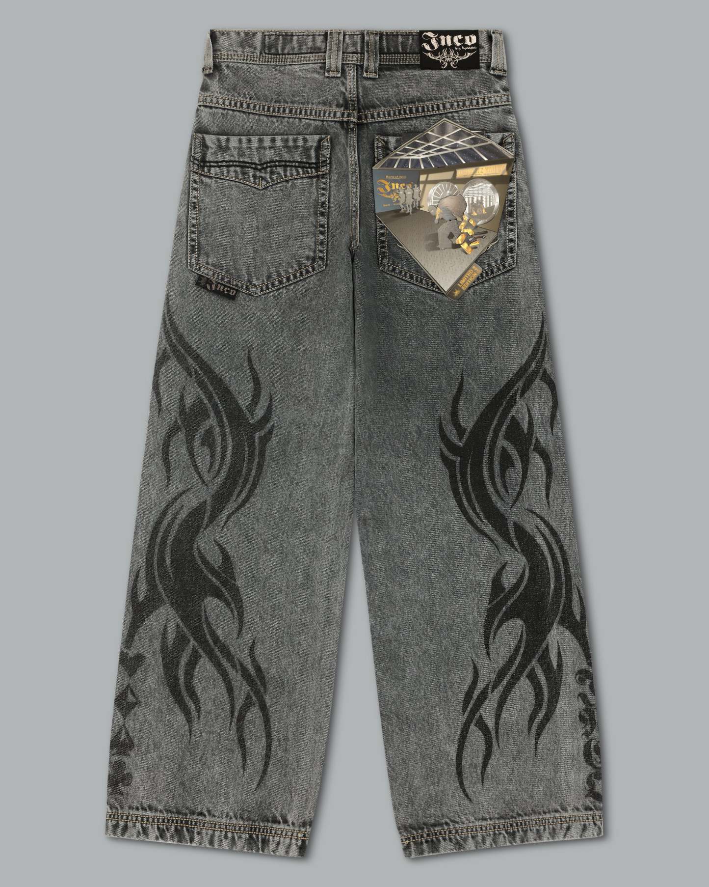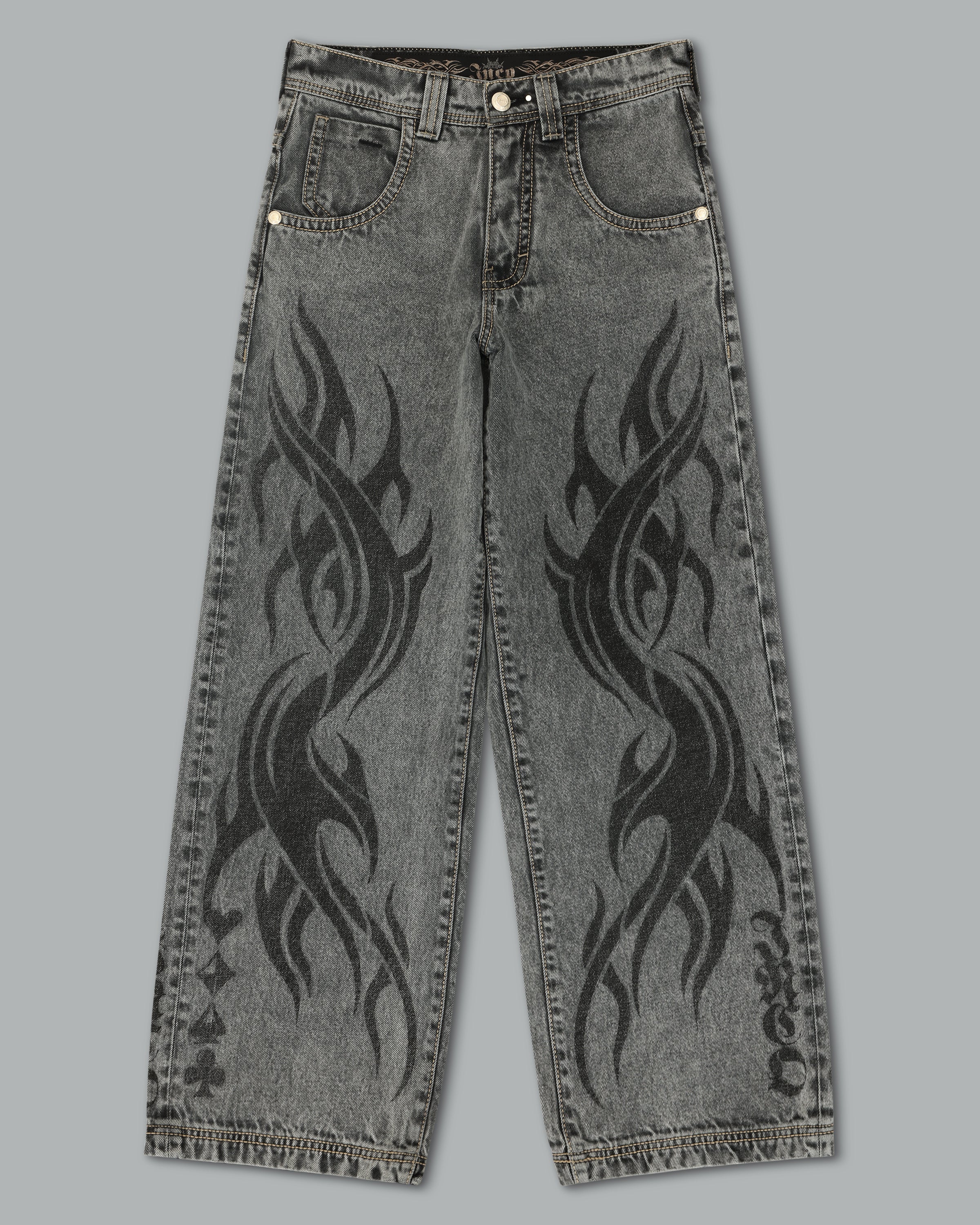 From the famous Tribal Collection. 13oz 100% cotton rope-dyed with a luxe starch wax finish and vintage “moonlight” wash. 23' bottom opening with contrast stitching and a wide-leg fit. Features tribal flame artwork printed down both legs, original Celtic-inspired tribal embroidery on the back pocket in pale white gold metallic thread, and the signature four-suit rivets. Collectible flasher included.