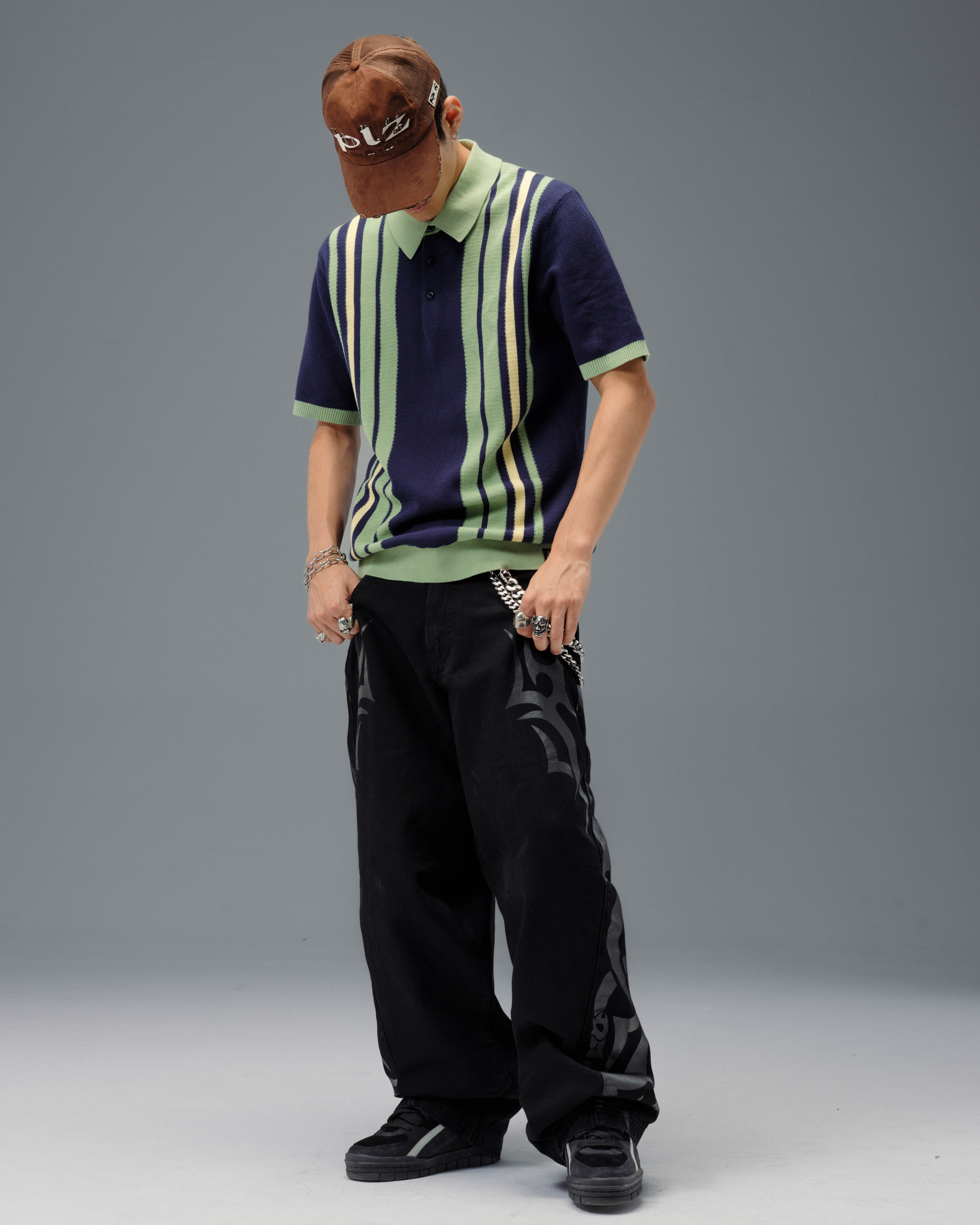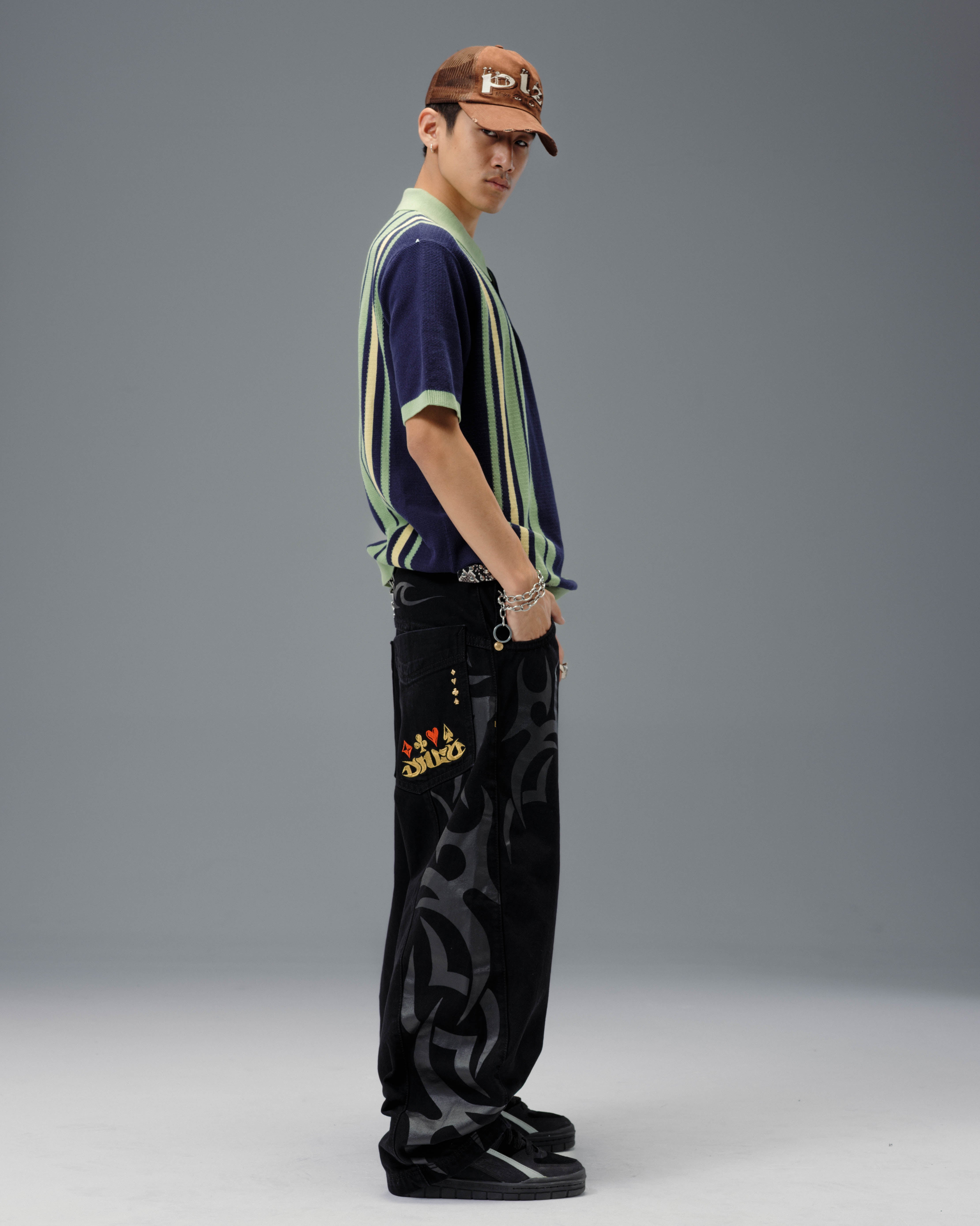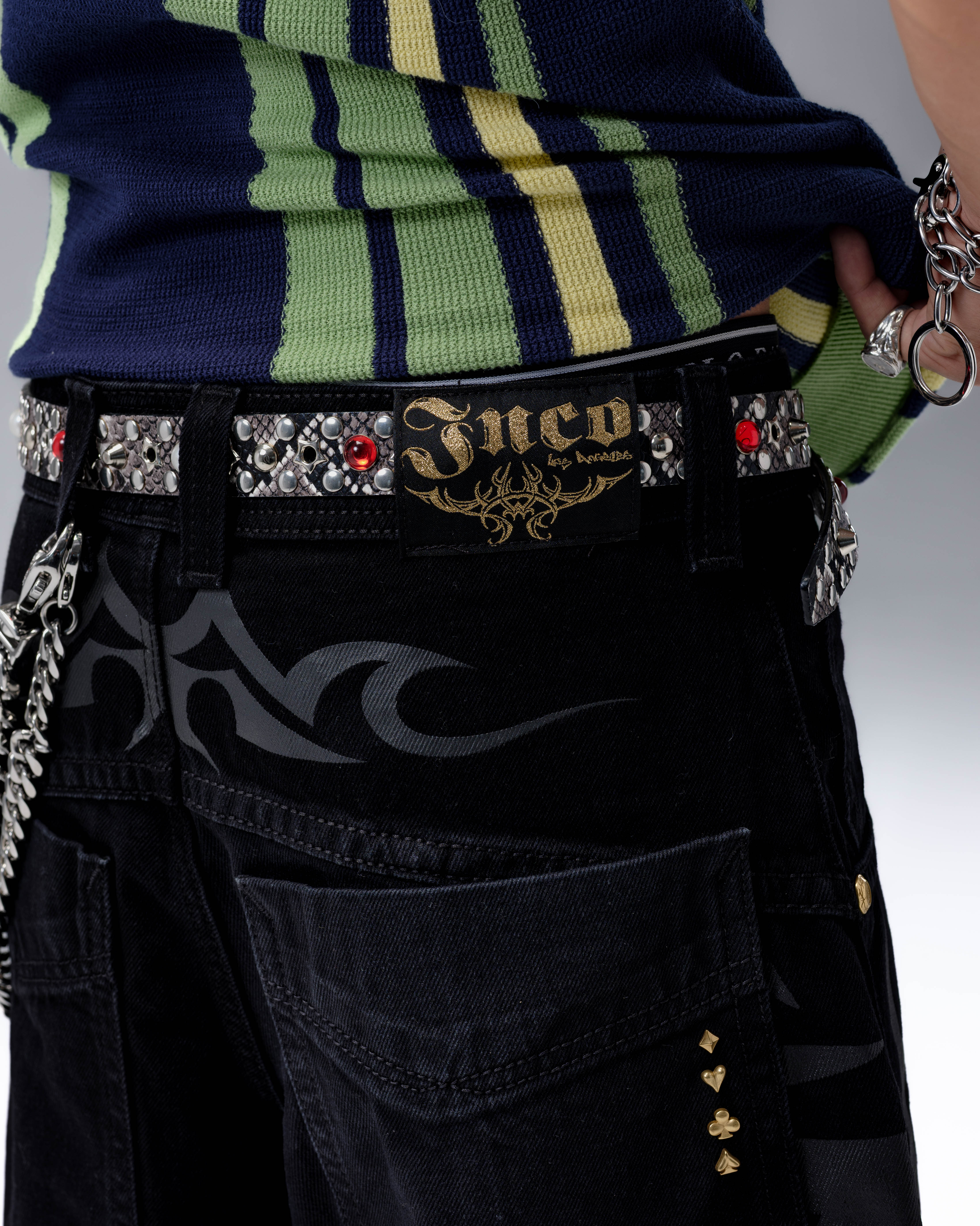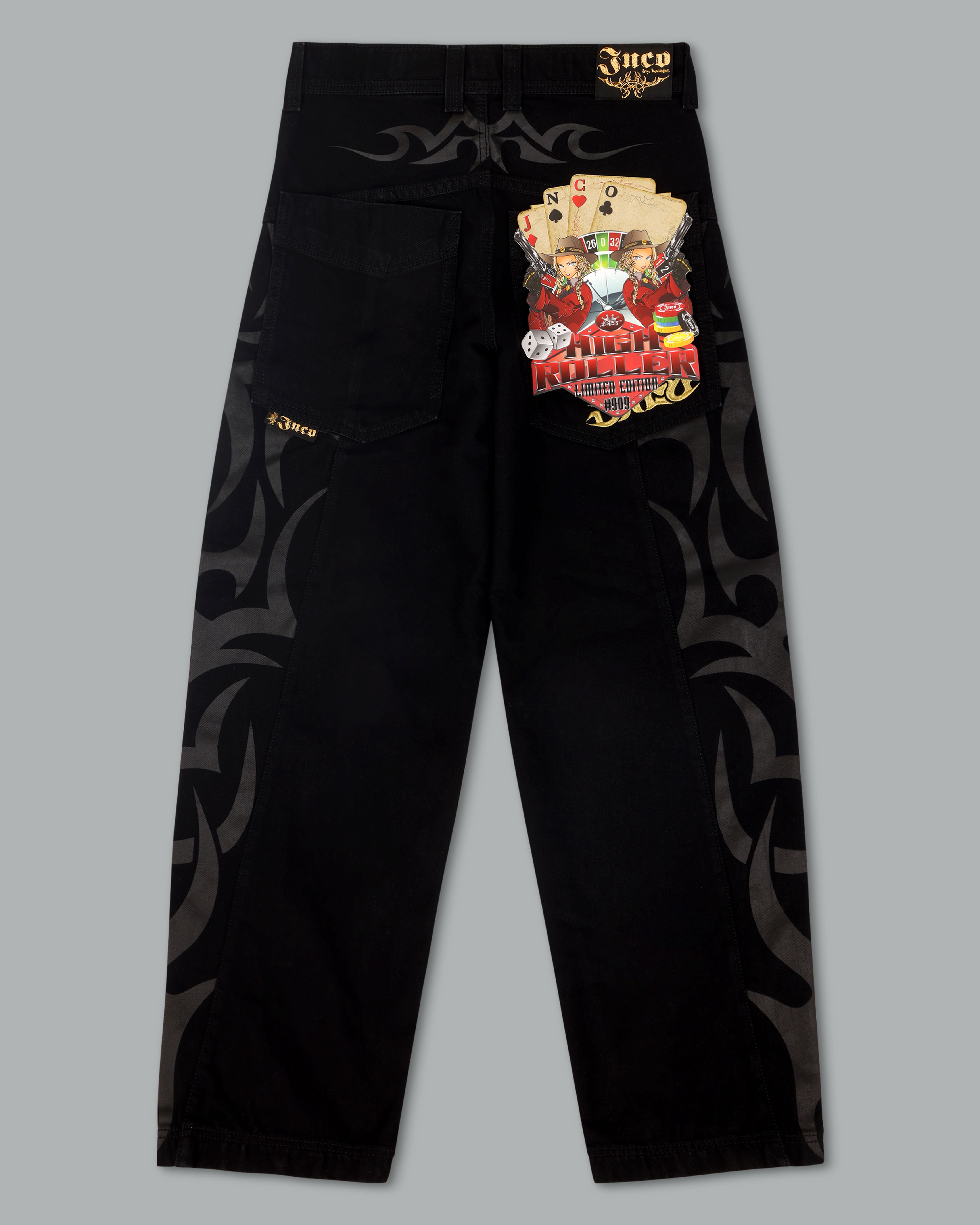 From the famous Tribal Collection. 13.5oz ring-spun cotton denim in Jet Black with bold twill texture and a smooth, structured feel. 21' bottom opening with heavy contrast stitching, oversized back pockets, and oversized fit. Features the original Tribal High Roller embroidery in yellow gold and red metallic threads, and custom hardware and printed tribal graphics.