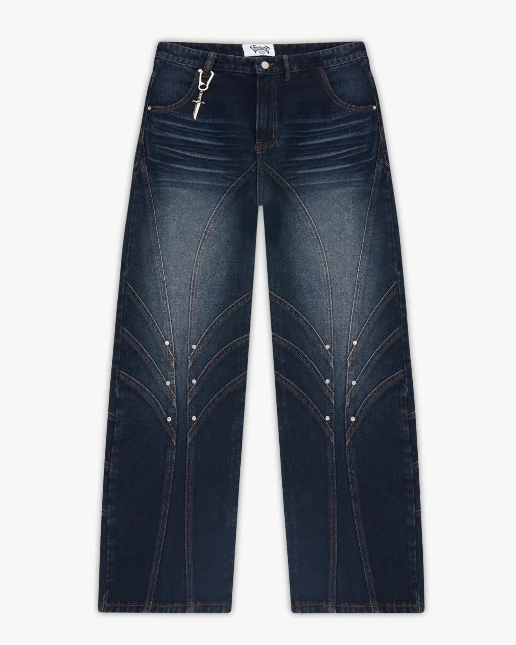 Inspired by medieval knights, this denim features front and back panelling finished with metal rivets at each intersecting seams. Subtle thigh fade w/ dark indigo wash. Embroidery of jousting knights on the back pockets. Custom sword-shaped carabiner, engraved with the Vescartes name.