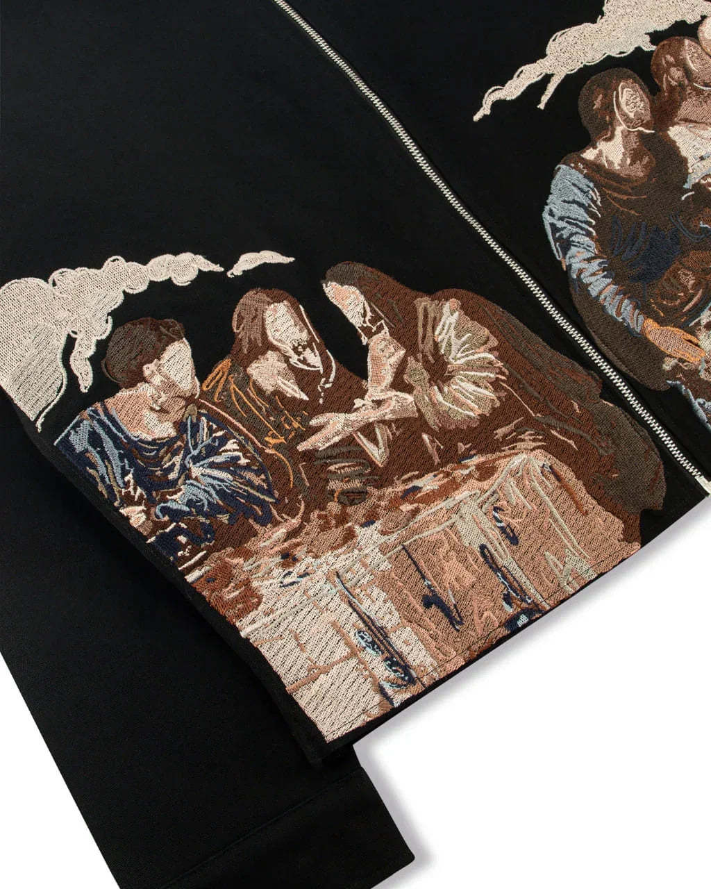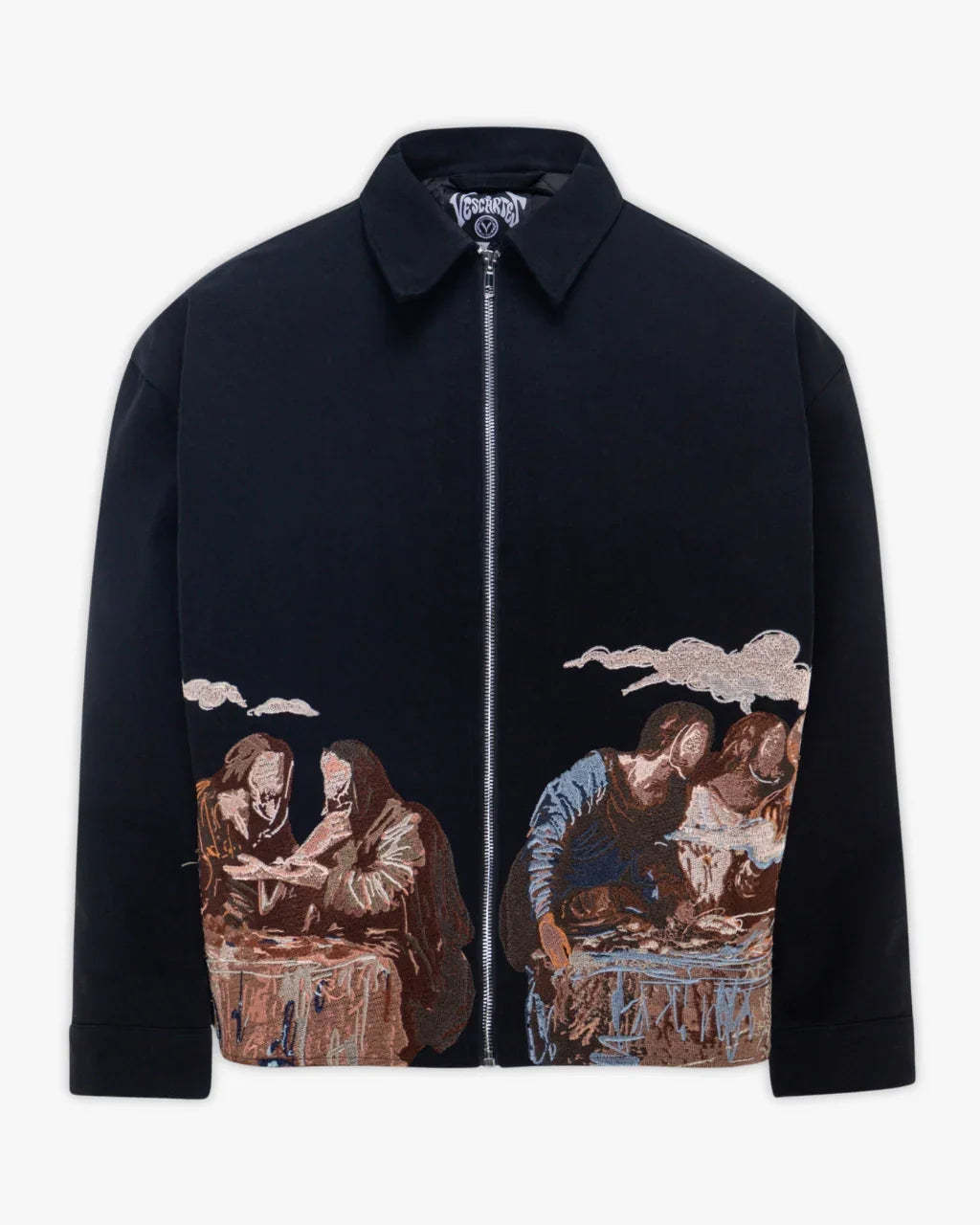 Black Canvas Jacket with the lower front and back panels adorned with over 2 million stitches, forming a reimagined version of Da Vinci’s Last Supper in muted, pale tones. Finished with a metal zipper and custom Vescartes hardware, it blends historical art with modern streetwear structure.