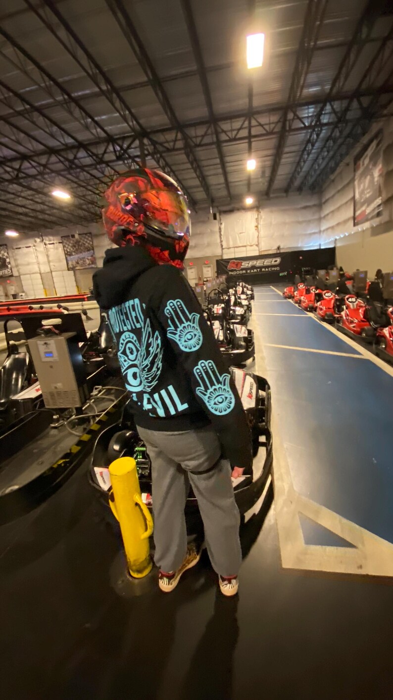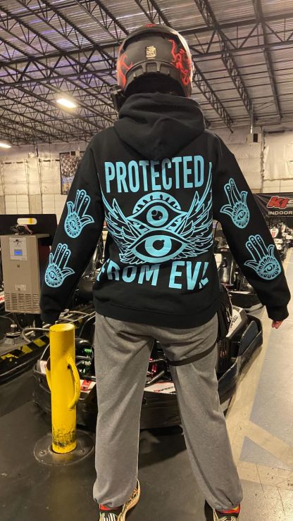 Protected From Evil Blue Reflective Hoodie - loose fit unisex nighttime essential riding pullover