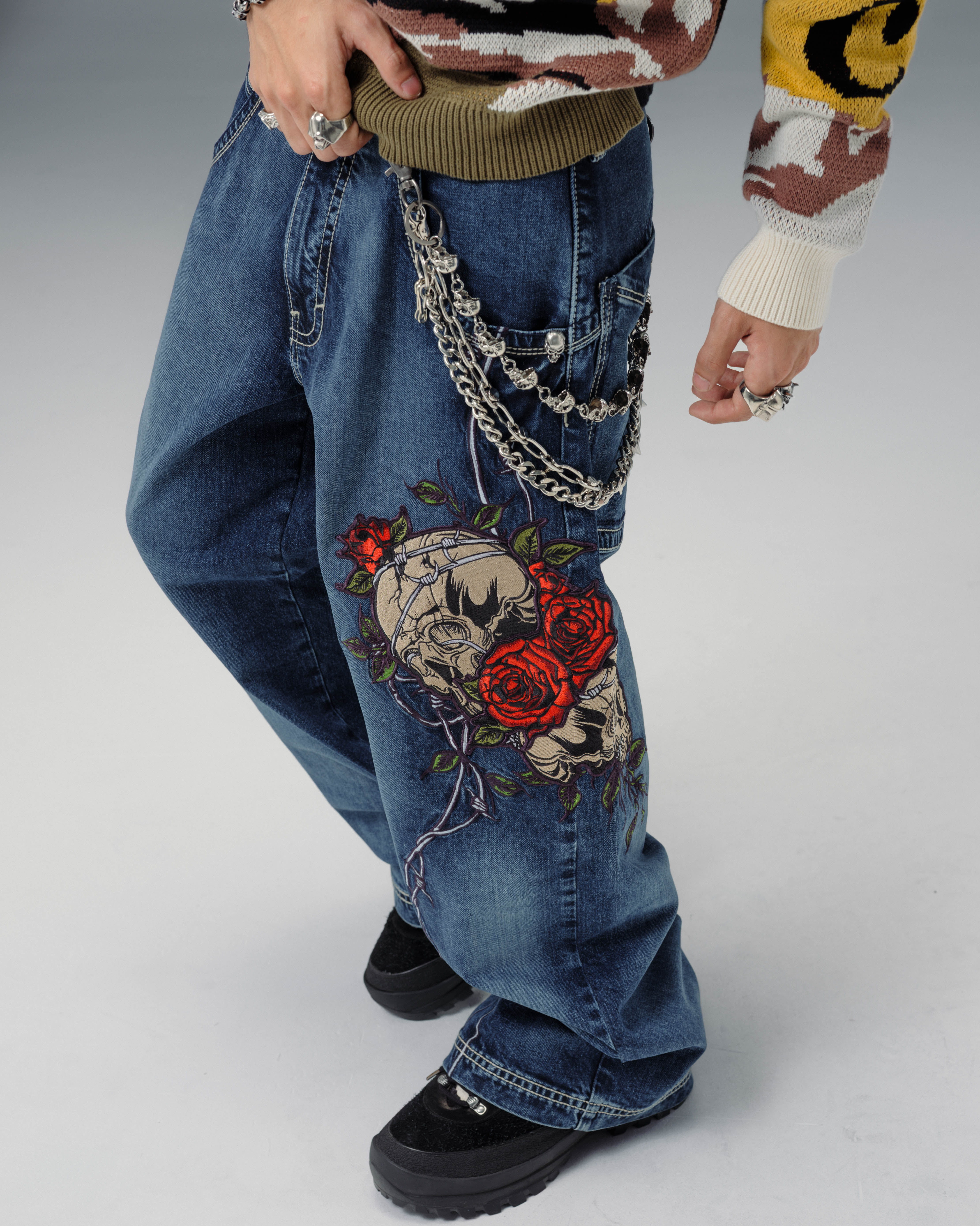 The legendary Skull & Roses. 13oz ring-spun denim in a Hand-Sand Dark Stone wash with a deep indigo tone and a structured, smooth silhouette. 24' bottom opening, contrast stitching, and custom skull and jewel hardware with an antique finish and quartz stones. Original patches and original embroidery, featuring a detailed skull wrapped in blooming red roses and twisted barbed wire, stitched with over 200,000 layered threads. Includes original labels and collectible flasher. Limited Edition — very limited stock.