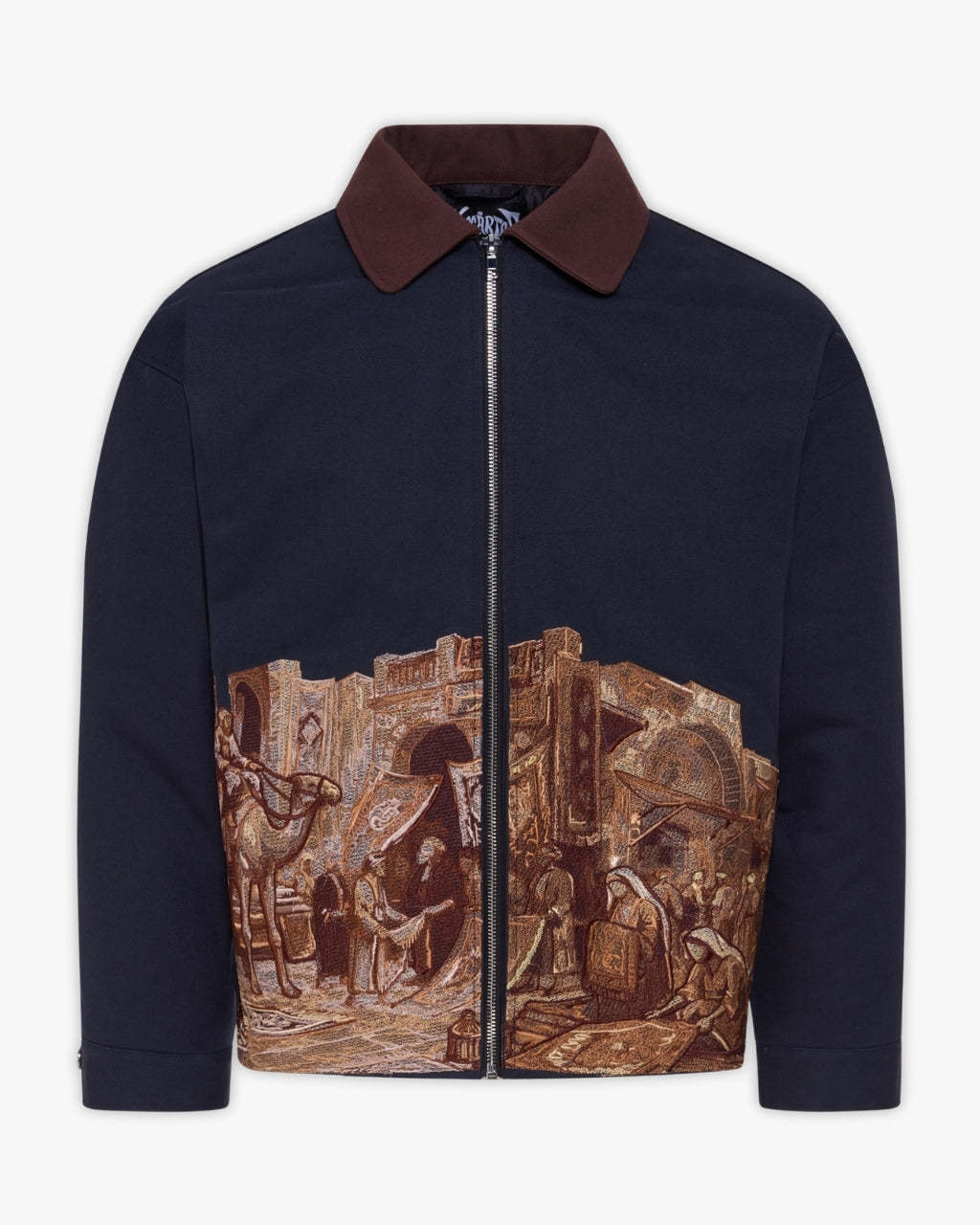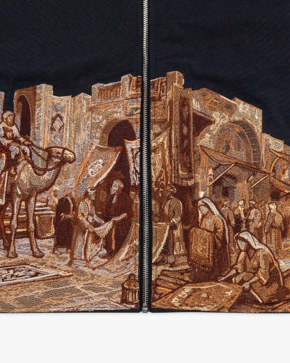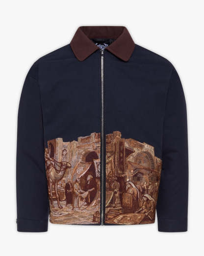Rooted in Middle Eastern tradition, this jacket reimagines the bustling souk through detailed stitched illustration across its base. The contrast collar and custom hardware enhance its refined workwear profile, while the artwork anchors it as a wearable canvas of history.